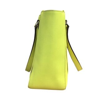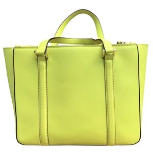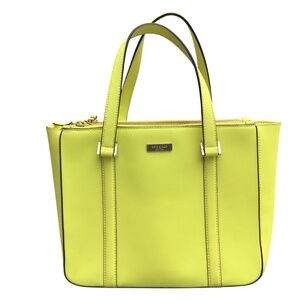 Stylish Newbury bag with colourful lemon lime leather, gold hardware, interior white and black patterned fabric, and dual handles.