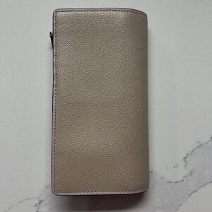 Light pink leather Kate Spade wallet. Leather is in good condition. A few marks. The fabric in the coin purse has darkened but otherwise in great condition