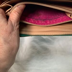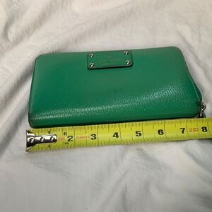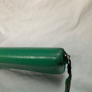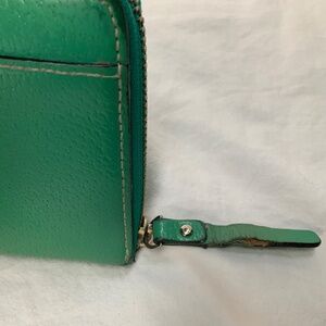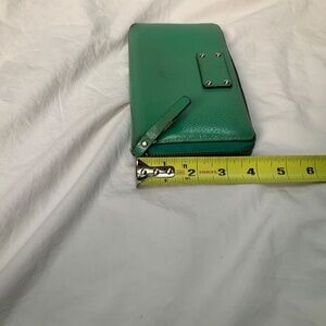 The wallet is in good, clean condition, though there is some wear on the corners and on the zipper pull tab. The inside is clean and in good shape, with some staining in the zippered coin compartment. It is a lovely sea foam or true green colour.