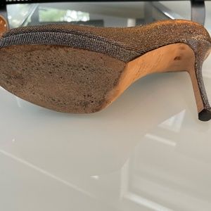 Smashing finish to any outfit these gold/silver shimmery heels change colour depending on how the light hits! Featuring an open toe and 4” heel these shoes are gorgeous. Worn only on very special occasions these shoes are in excellent condition.