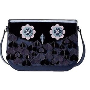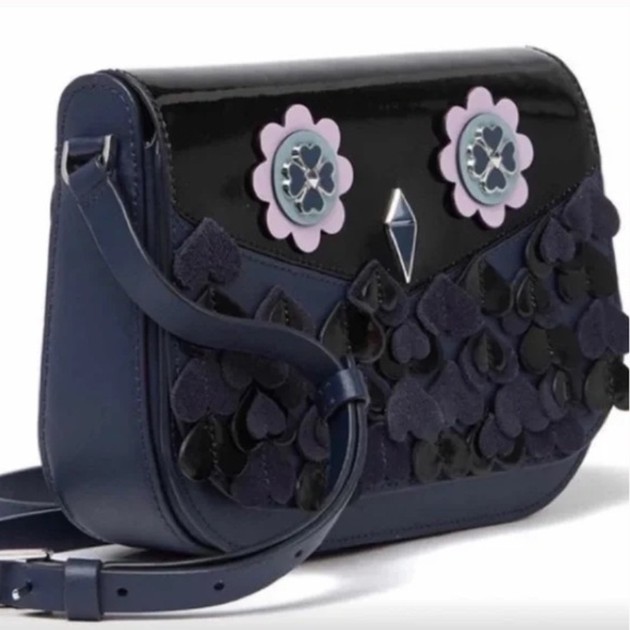 Add a playful touch to your collection with this Kate Spade Zibbi Flap Owl Shoulder Bag. Crafted in smooth grain and patent leather, with signature Kate Spade whimsy, the bag features an adorable owl face design with chic details. Large ‘owl’ eyes are crafted from floral and heart embellishments, and cut out hearts in suede and patent leather create a ‘feathered look.’