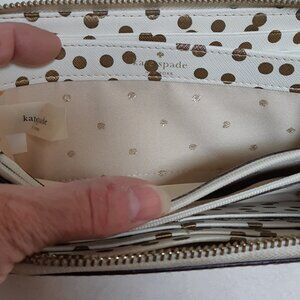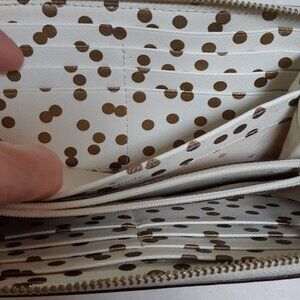 KATE SPADE NEW YORK Beige polka dot zip wallet; credit card slots and room for cash; light staining around zipper (see photos) but in excellent gently used condition; inside looks great; 100% Cow Leather Imported 100% Polyester lining Zipper closure 4" high 7.75" wide; and hardware logo spade at front.