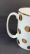 Elegant white mug with gold polka dots. Stylish and modern design. Perfect for any kitchen.