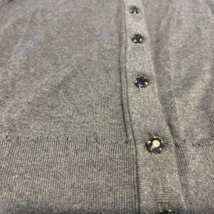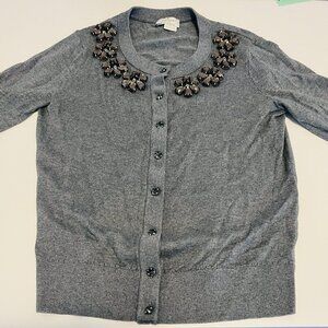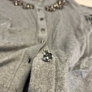 Short cardigan with silver-greyish buttons and flowers on the neck, goes with dresses