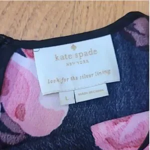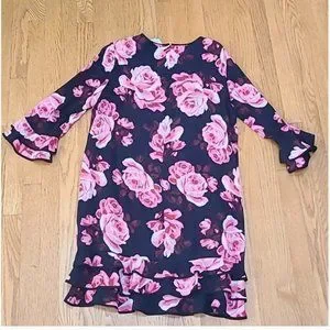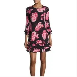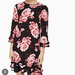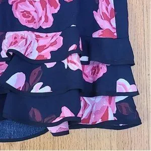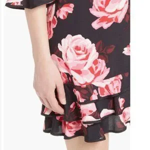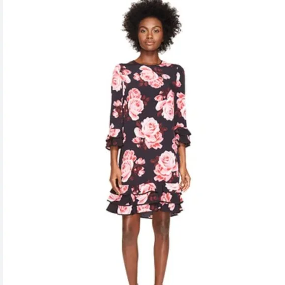 Kate Spade Floral Ruffle Tiered Black & Pink Rose Print Rosa Shift Dress size large like new no tags