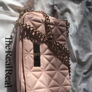 Beautiful light pink leather quilted crossbody bag with double chain straps and silver hardware. Very good condition. Inside zippered compartment and 1 inside pocket. Turn clasp.