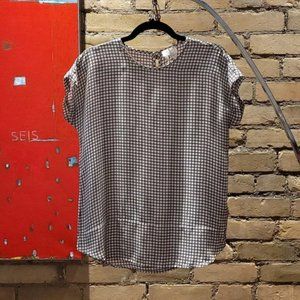 Kate Spade silk blend top, size 4 in pink creme and black grid with very subtle light salmon connecting dots. Pullover top with single button back at neck keyhole closure and slight cap sleeves. Pairs beautifully with black leggings.