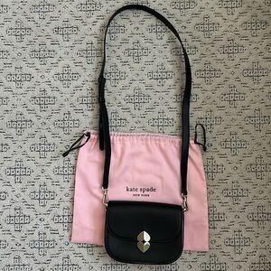 Kate Spade small black leather purse. Bottom & sides are pink and red leather. 7.75” across, 6” high, 2” deep. Strap adjustable. Comes with dust bag. I’ve never used - inside in perfect condition. Very small mark on front, see last photo. Have to 👀 very hard to see it!