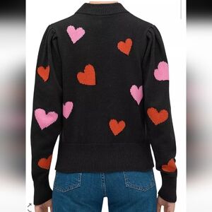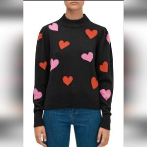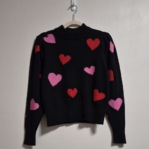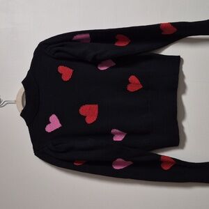 Black sweater with pink and red hearts. The red hearts are done and in metallic threading. It has pleating on the shoulders and a ribbed collar, cuff and bottom. Material tag has been removed but it is 55%cotton, 37% nylon and 8% wool. Pit to pit is approximately 19" and length is 21". Gently worn.