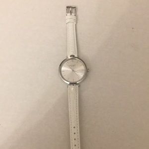 Silver watch with white strap. Strap has been replaced, not the original.
