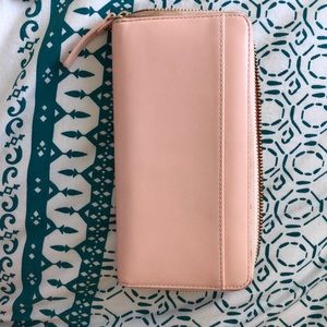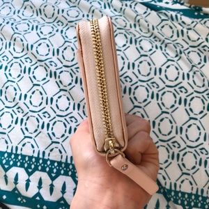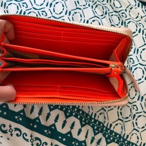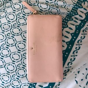 Really pretty pink Kate spade wallet. It is in used condition, there is unfortunately a coffee stain on one part of the zipper, I have not tried to clean it but it may come out with some baking soda.