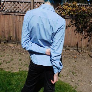 NWT. Katherine Hamnett light blue ladies dress shirt. Curved hem can be worn tucked or not. Cuffs and collar. A wardrobe staple. The quality of this shirt is excellent.