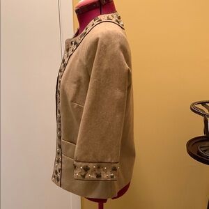 Elegant tan jacket with stylish embellishments. Perfect for adding a touch of sophistication to any outfit.