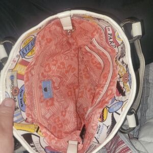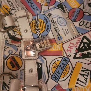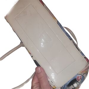 Explore in style with this chic travel-themed tote bag. Featuring a vibrant design on a white background, it's perfect for any adventure. Has a magnetic snap closure with inner slots and a zippered pocket. Has 2 side pockets and 1 back slit pocket.