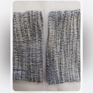 Salt and pepper with so many charming details. A gentle V neck with green ribbon trim. Two front pockets with colorful bands. The back panel is multi colored and the skirt has a dark purple section. This dress is an A-line and it slips on. This long sleeve garmet could be worn as a top, tunic or dress. No material tags present but garmet is multi textured.