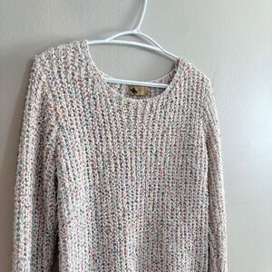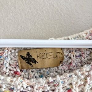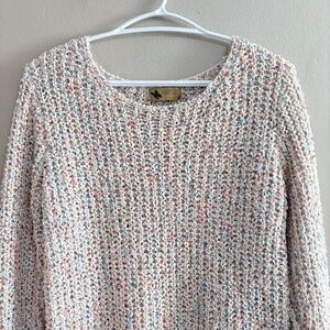 Katsumi crewneck sweater in a soft cream knit with playful rainbow stripes across the chest. Cozy, colorful, and made to brighten up any outfit.