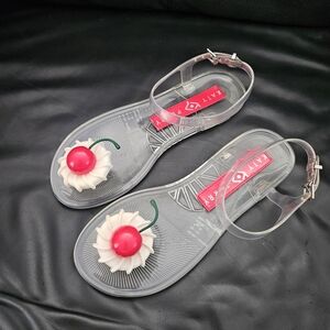 Clear jelly sandals featuring a playful cherry design. Perfect for a fun and casual look.