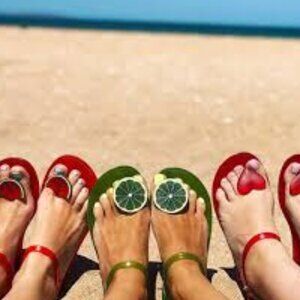 • Flexible, PVC sole with adjustable buckle ankle closure. Toe thong with novelty a slice of lime detailing