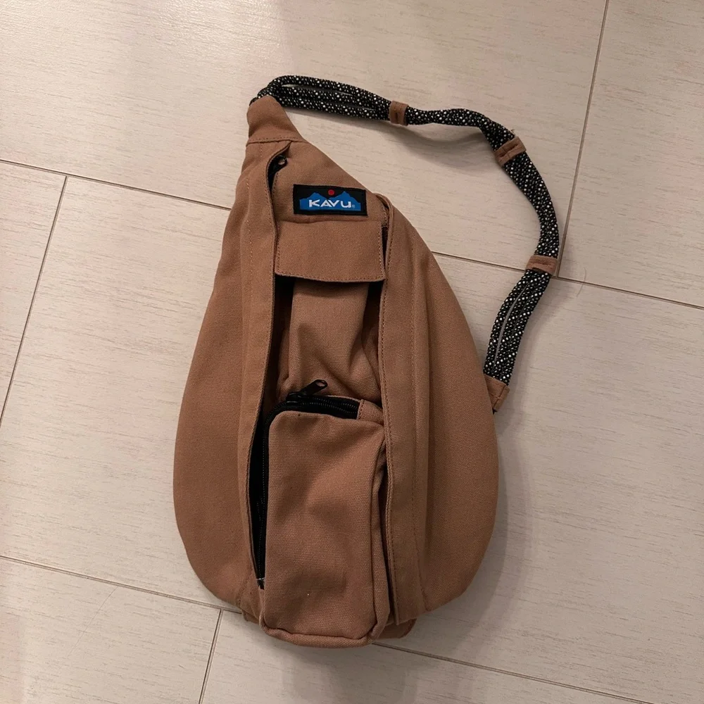 This polyester mini sling pack features an adjustable rope shoulder strap and side release buckle, two vertical zip compartments, two key or cell phone pockets, padded back with KAVU embroidery