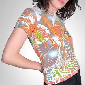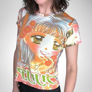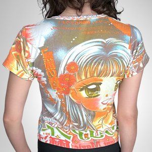 A slightly cropped fitted t-shirt with a super kawaii anime girl floral allover screen print in hues of orange and pink with green accents.