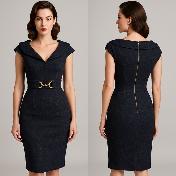 Gorgeous Kay Unger cocktail party, formal special occasion, navy-blue short sleeves dress with the gold hardware. Fully lined , invisible zip at back.