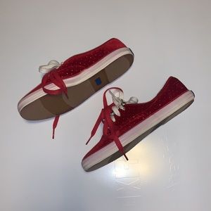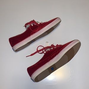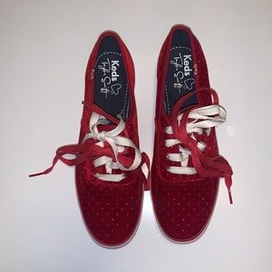 EUC Keds special edition “Taylor Swift” red velvet sneakers with gold polka dots and heart hang tag in women’s size eight.