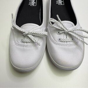 Women’s ‘T-Cup CVO’ white canvas flat pumps with polka dot laces from Keds. Crafted with a soft-textured canvas upper, the flats feature a two eyelet lace-up fasten, rounded toe, and a cushioned insole. Set on a textured rubber outsole, the ‘T-Cup CVO’ pumps are complete with a tonal woven brand tab to the topline and a contrasting blue Keds licence plate to the heel.