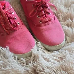 These vibrant coral sneakers are made from sturdy canvas, offering a timeless lace-up style. The rounded toe and clean white soles enhance their classic appeal, making them perfect for everyday wear.