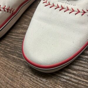 Keds Blue Jays Size 10 EUC near new condition sneakers, featuring a crisp white design accented by bold red stitching reminiscent of baseball seams. The classic lace-up style and flat sole offer comfort and timeless appeal. Perfect for casual outings, these sneakers celebrate a vintage charm with a nod to America's favorite pastime.