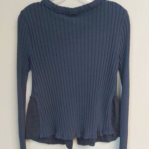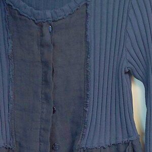 Created in Poland by a designer that focuses on simple, elegant clothing of luxurious fabrics is this unique cardigan. From the spring/summer 2025 collection, it is made of a knitted, stretchy cotton at the front, the back and on the sleeves and is complemented at the front panels, front hemline and pockets in linen. The knitted cotton allows for a cozy feel while the linen portions provide that light, airy detail. It has a full button front closure with a placket to hide the buttons for a sleek look when desired, an extra button is included on the back of the inside label. The size label indicates a Polish size 42 which converts to size 38 (6/8 US and the fabric content translates from Polish to English as cotton and linen. This is a gorgeous, quality garment that will you carry you through any season.