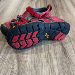 These rugged Keen sandals are perfect for active kids who love outdoor adventures. In a bold red color, they feature a durable rubber toe guard, quick-dry webbing, and an easy-on bungee lace system for a secure fit. Ideal for summer fun, water play, or everyday wear.