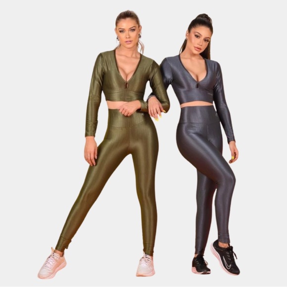 A bold pair, this sporty set features a v-neck cropped tank with long sleeves and matching high-rise leggings in a soft fabrication.