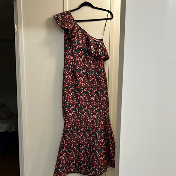 Embrace elegance with this stunning floral one-shoulder dress. Perfect for any occasion, this dress features a beautiful red and black pattern that stands out. Ideal for making a statement. Back zipper, Length shows from pit. No stretching