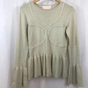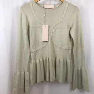 New with tags from Keepsake the Label - a mid weight knit fit and flare top/sweater with ribbon detailing. Oatmeal in colour with subtle metallic sparkle! Crew neckline, long flared ruffle cuffs, and ruffle hem. Would pair really well with so many pieces; from jeans to slacks to skirts. Size US 4 or small.