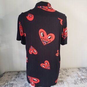 Keith Haring Ripple Junction Red Heart Smile Print on Black Button Up Shirt