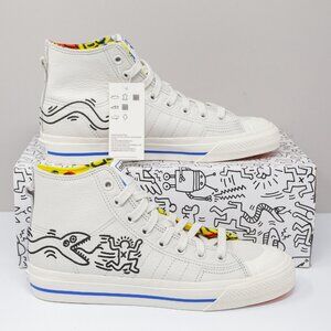adidas pays tribute to the late artist and LGBT+ rights activist Keith Haring with a special makeover of the classic Nizza High RF. Launched in June 2019, this 'Pop Art' edition's leather upper shows a snake wrapping around the heel and chasing one of Haring's iconic cartoon bodies. A graffiti-inspired interior print celebrates his colorful, abstract 90s-era style. A bright stripe to the midsole and a color-pop outsole adds a quirky flourish.