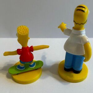 One Bart Simpson on a skateboard (approx. height is 2.5 inches) and one Homer Simpson (approx. height is 3.5 inches) figurine. Made in China for Kelloggs Canada Inc, I believe from 2003 marketing promotion.