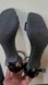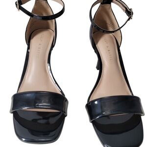 These Kelly & Katie heels feature a sleek black patent leather finish with a minimalist design, including a single toe strap and a secure ankle strap with buckle closure. The open toe and clean lines create a sophisticated silhouette, perfect for both casual and formal occasions.