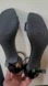 These Kelly & Katie heels feature a sleek black patent leather finish with a minimalist design, including a single toe strap and a secure ankle strap with buckle closure. The open toe and clean lines create a sophisticated silhouette, perfect for both casual and formal occasions.