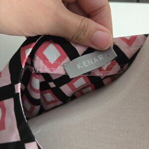 Great Used Condition (GUC/EUC). A vibrant and eye-catching blouse from Kenar. This short-sleeve top features a bold pink, black, and white geometric diamond print. Made from 100% Polyester, it has a light, flowy, sheer feel with a V-neckline.