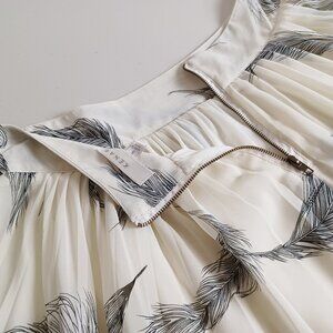 A pretty skirt in a soft cream colour with feather prints. Made from a lightweight chiffon material, it's airy and sheer with lining underneath. It has pleats at the front and back, and falls at knee length. Perfect for summer. Great condition.