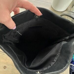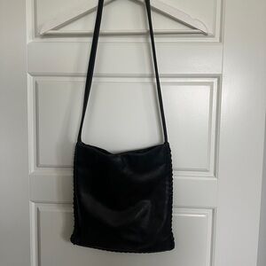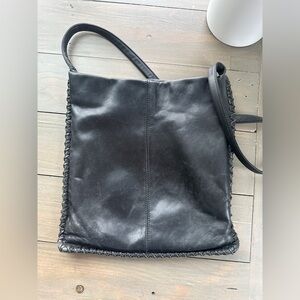 Sleek black leather tote. Features braided edges. Perfect for everyday use.