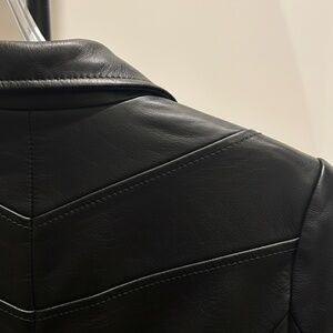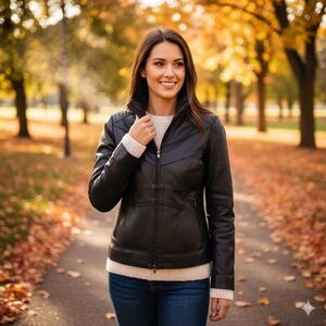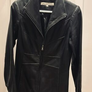 Description: Luxurious, ultra soft lamb leather jacket. Absolutely stunning to wear. Two side pockets. Looks beautiful zipped up or open!