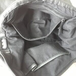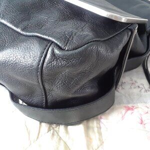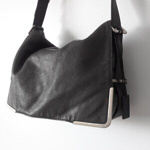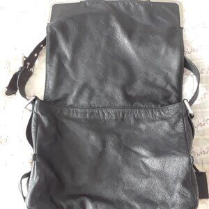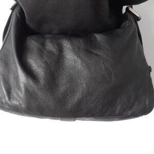 Absolutely stunning "vintage" 2000s messenger style shoulder bag from Kenneth Cole. Features a comfortable wide leather shoulder strap with a leather shoulder patch for comfort (as seen on Balenciaga city bags). The strap is adjustable on the side with a buckle and there are three settings. Silver hardware can be seen on the sides of the bag and on the front corners. Large main leather flap closure with no snap, magnet, etc. One large interior compartment with a black fabric lining.