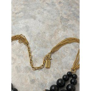 Lovely Vintage Necklace, swag design and matching Dangle Earrings. Black Beads with Gold Tone and clear stone accents. Kenneth Cole, New York design. Gold chain consisting of 8 strands. Necklace measures 16" in length with a 2.5" extender. Has a large lobster claw closure Marked KC. "Kenneth Cole New York" hang tag. Earrings consist of a small gold tone hoop and one dangle bobble, 1" dangle to match necklace. In Good Condition. No returns or exchanges.