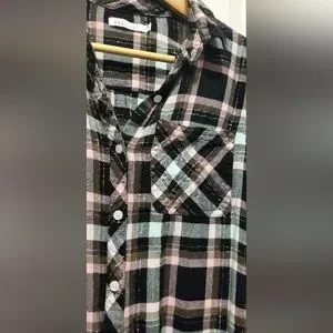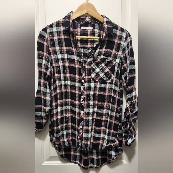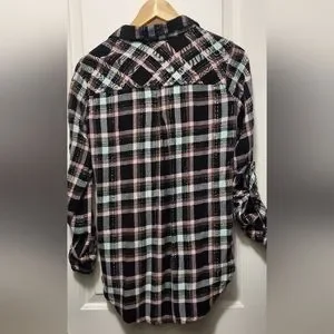 checkered pattern buttoned down shirt with a roll up cuff strap (I don't know what to call this hahahahaa)