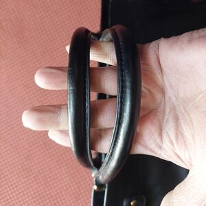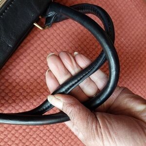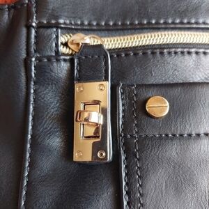 Kenneth Cole Reaction Black Synthetic Satchel Bag. Outside front zippered compartment with zipper running across front to side. Smaller front pocket in front of zippered compartment. Zipper has turn latch to secure compartment. Top snap closure. Gold-tone embellishment.