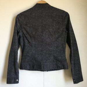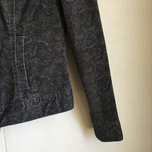 Very good preowned condition Kenneth Cole Reaction moto-style jacket with lace and paisley pattern print throughout. This jacket stops just below the belly button or waist for a flattering semi-cropped fit. The mock neck gives it a sophisticated edge and provides added warmth. A versatile layering piece that works well under other coats or on its own. Has a subtle denim-like look. Photo with model shows the overall cut, with fake leather instead of the lace-printed denim. I photoshopped the print, however it is considerably smaller on the actual jacket. The version I'm selling also has no pockets.