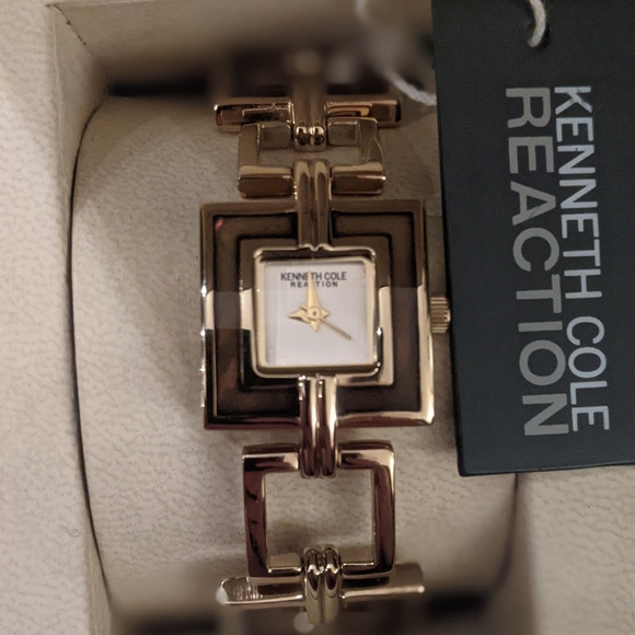 Elegant gold-tone watch by Kenneth Cole Reaction. Features a square face and link bracelet. This watch is the perfect combination of modern style, and timeless elegance. NIB and OBO.