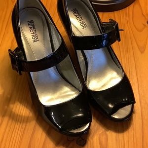 Designer Kenneth Cole Reaction black patten, pea toed, front strap buckled high heel shoes. Size 7 1/2. Excellent condition.